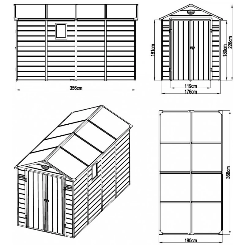 Avec une façade de 176cm pour une profondeur de 356cm, l’abri Jôbu de 6,99m² est la solution idéale pour le rangement de votre outillage de jardin. Parfait aussi pour ranger des vélos, une tondeuse à gazon ou une brouette, cet abri en résine pourra servir aussi de local pour entreposer vos conteneurs à poubelles. Grâce à sa hauteur faîtière de 226cm et ses parois de 184cm, vous disposez d’une surface au sol de 6,13m² pour un volume de 12,9m³.