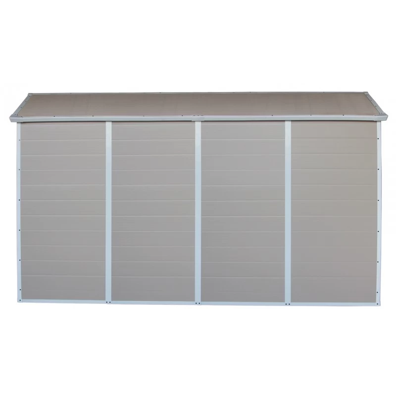Le coloris beige des panneaux s’intègre harmonieusement dans tout type d’aménagement extérieur, et les bandes blanches des raccords ou entourant la porte offrent un contraste élégant. Située au dessus de la double porte, une grille de ventilation assure un renouvellement de l’air par convection, pour une protection optimale de votre outillage. Sur le côté, une fenêtre fixe en polycarbonate apporte un éclairage naturel pendant la journée, vous dispensant d’amener un éclairage électrique. Cet abri est certifié CE, REACH et RoHS et dispose d’une garantie de 10 ans.