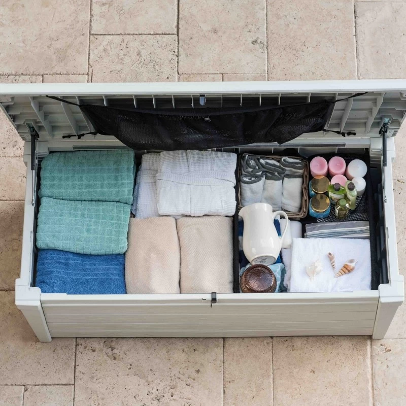 Pour une étanchéité parfaite et une meilleure résistance aux intempéries, ce coffre de piscine de la marque Keter est fabriqué en résine. Traité anti-UV, il vous offre un espace bien aéré et une ouverture douce puisqu’il est équipé de pistons. Il suffit d’ajouter un cadenas pour sécuriser vos affaires.
